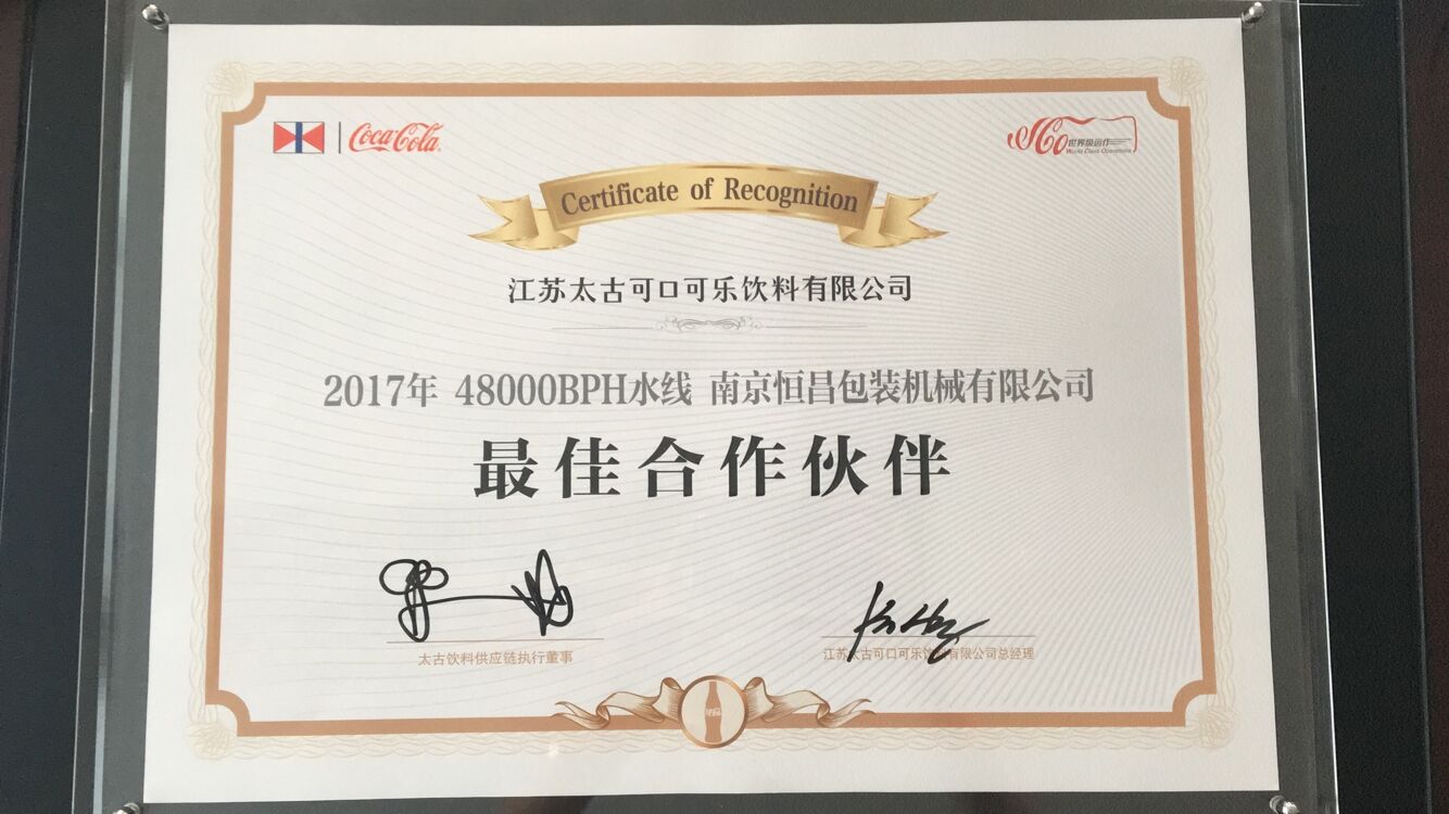 南京恒昌包裝作為后段整包商,在江蘇太古可口可樂(lè)48000bph水線項(xiàng)目中獲得“最佳合作伙伴”殊榮!